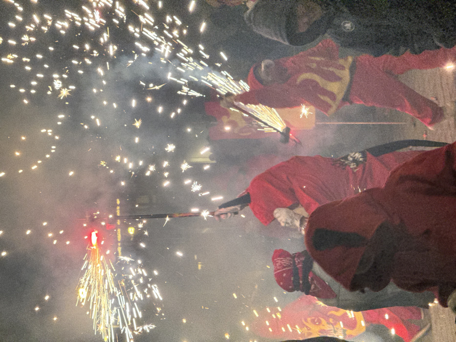 People in red costumes are holding sparking fireworks wands. The costumes appear to be themed after devils or fire. One person is wearing a yellow flame emblem. Thick smoke and bright sparkles fill the air, obscuring details. Some onlookers are visible, wearing dark clothing. It appears to be a festival or performance at night.