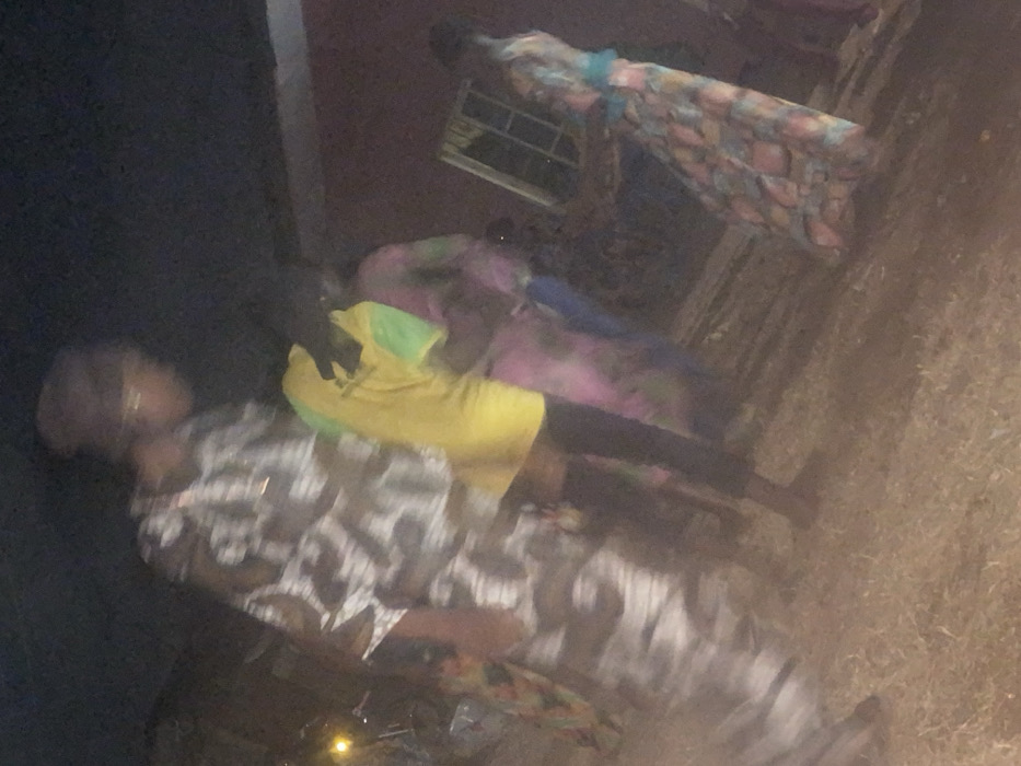 Three people are resting outside a building at night. The first person wears a white and gray patterned outfit. The second person is in a yellow shirt with black pants. The third person is in a multi-colored dress. A small window is visible above the person in the dress. The image is dark and slightly blurred, making it difficult to discern fine details.