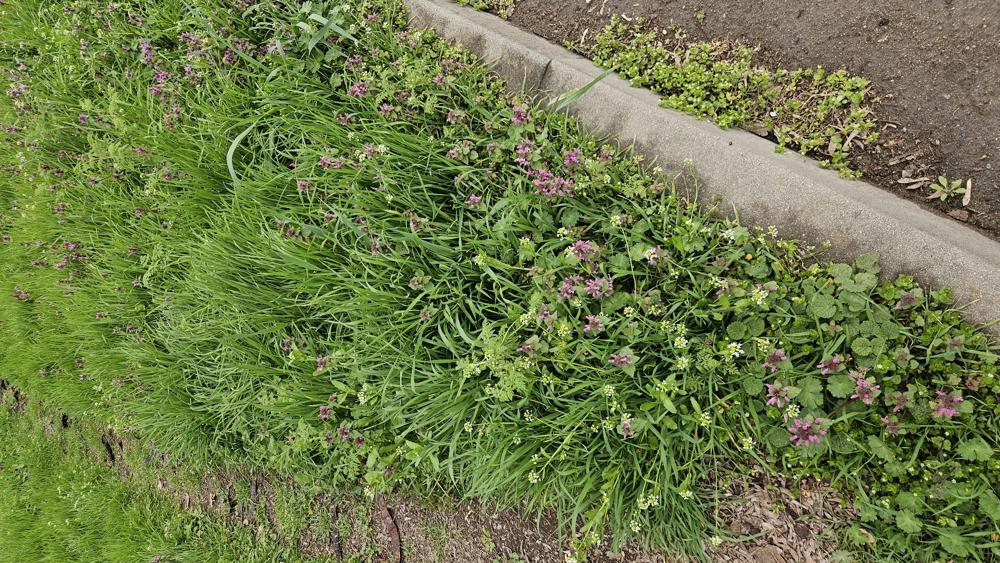 roadside scene. On the left is a patch of tall green grass interspersed with small purple and white flowers. This merges into a lower-lying area with a mix of plants including purple dead-nettle, shepherd's purse, and ground ivy. A concrete curbstone separates the vegetation from a dirt/gravel shoulder on the right. A small, unidentified plant is growing in the dirt on the right. The location is not specified in the image.