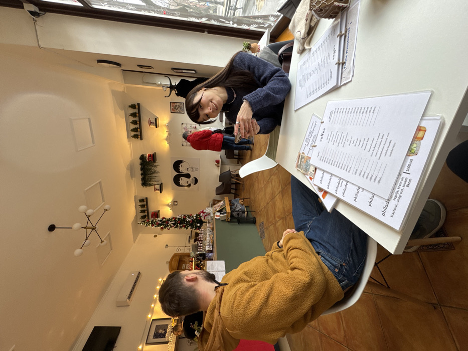 The scene depicts the interior of a brightly lit cafe or coffee shop located in Subotica, Serbia. In the foreground, a white rectangular table occupies the center, with a male and a female individual seated opposite each other. The male, positioned on the left with his back partially towards the camera, wears a mustard yellow fleece jacket and blue denim jeans, seated on a white Eames-style chair. His head is turned slightly to the left. The female, seated on the right and facing the camera, has long dark hair and wears a dark blue knitted sweater. She is holding a dark-colored smartphone with both hands, looking at the camera and smiling. On the table between them, several white laminated menus are visible, some displaying "coffee" and "philade" (likely referring to Philadelphia cream cheese or similar products), with text in Serbian and prices listed in Serbian Dinars (RSD). A small, decorative wooden gingerbread house-like object rests on the table near the female. The cafe's interior features white walls and a light brown tiled floor. In the background, to the left, a green-painted service counter with coffee-making equipment, bottles, and display items is visible. Behind the counter, an individual's head is partially discernible. A tall, decorated Christmas tree with red and gold ornaments and lights stands between the counter and the back wall. Further back on the right, a male figure wearing a red jacket is partially visible, standing near another table. Wall decorations include horizontal shelves with small green plants, wall sconces providing accent lighting, and two large, stylized cartoon-like black and white illustrations of faces. A modern chandelier with multiple spherical white lights hangs from the white ceiling, which also has recessed square panels and an air conditioning unit. To the right, a large window allows natural light into the space and offers a blurred view of an exterior street scene.