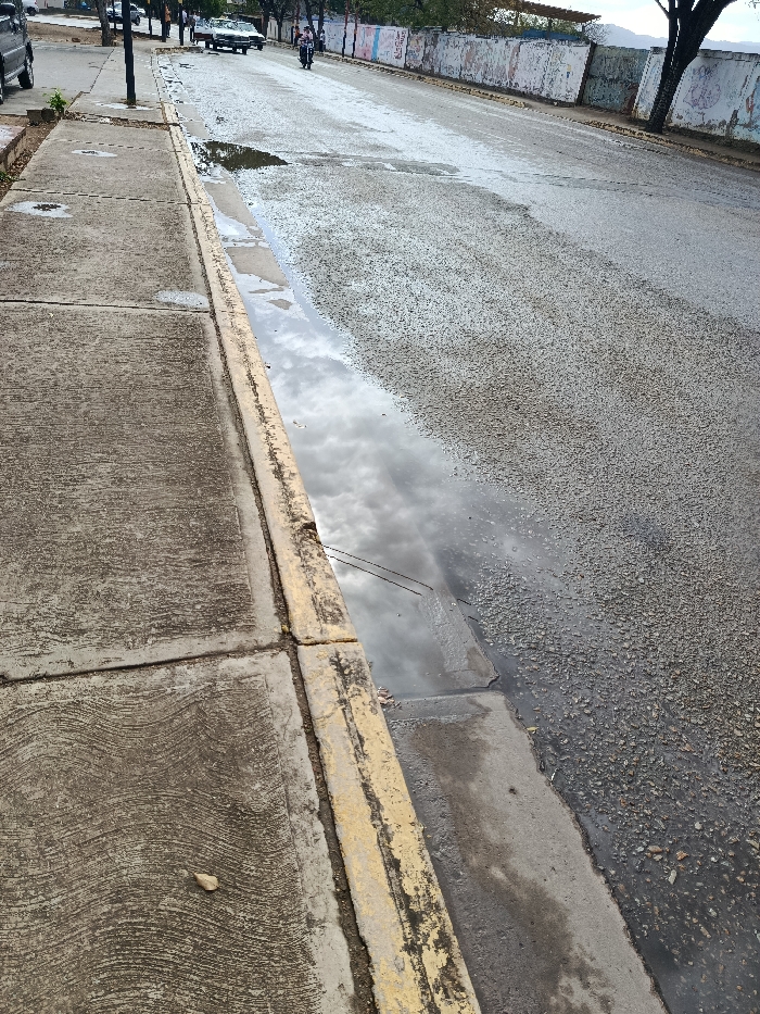 The image presents a street view in Altagracia, Venezuela, under an overcast sky. In the immediate foreground, a grey concrete sidewalk with segmented sections and a wavy texture runs left to right. A worn yellow-painted curb borders the sidewalk, separating it from the adjacent asphalt road. The road surface is visibly uneven, with areas of exposed aggregate and significant puddles of water that reflect the cloudy sky above. Further down the street on the left, a dark-colored SUV or truck is partially visible, parked at the roadside. Beyond it, a white classic car and a single individual on a motorcycle are observed in motion, traveling away from the camera. Multiple indistinct human figures are also visible walking or standing on the sidewalk opposite the camera's perspective. Along the right side of the road, a low, elongated concrete wall features faded painted murals and graffiti. Trees are visible beyond this wall, and distant hills or mountains are discernible against the horizon under the cloudy conditions.