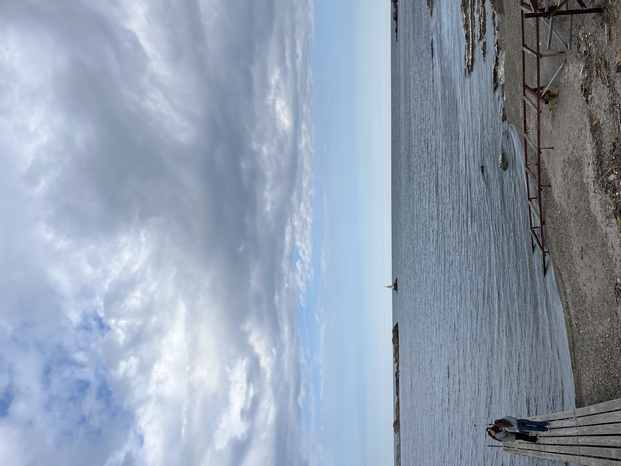 The image depicts a seascape in Ahtopol, Bulgaria, with the horizon oriented vertically. The left half of the image shows a cloudy sky with patches of blue. The right half features the sea, a coastline with visible rocks, and a small lighthouse in the distance. Along the bottom edge, a wooden pier extends into the water, where two individuals are present. A metallic structure runs along the shore above. Debris and trash are scattered along the coastline.