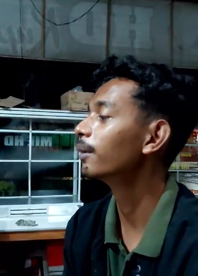 side profile of a young man with dark, curly hair, a mustache, and dark skin. He is wearing a dark jacket over a green collared shirt. He exhales a puff of smoke from his mouth. He then brings a cigarette to his lips. The background is dark, but a white, rectangular display case with multiple glass panes is partially visible. Some items are visible inside the case. Above the case are white panels, possibly parts of a ceiling or wall, with some dark lines and writing on them. A table and chair are also partially visible. The lighting is dim.