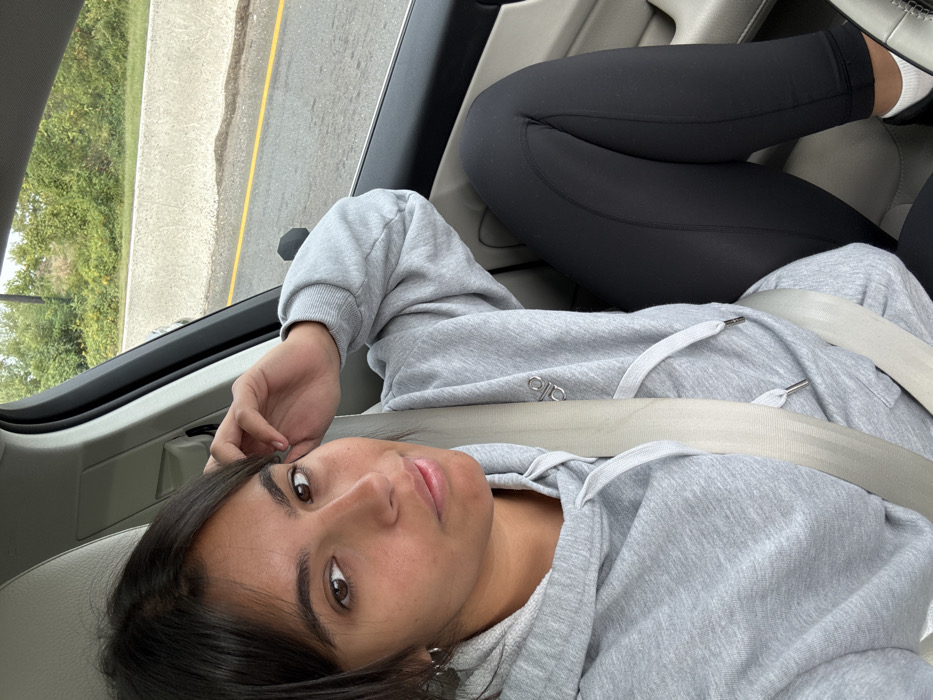 A female individual is seated in the front passenger seat of a vehicle, secured by a light beige seatbelt. She has dark hair and brown eyes, looking directly at the camera with a neutral expression. She is wearing a light grey hooded sweatshirt with an "alo" logo on the left chest, black leggings, and white socks. Her left hand is positioned near her head, with a small silver hoop earring visible in her left ear. The car interior features light-colored trim and upholstery. Outside the passenger window, a highway scene is visible, characterized by an asphalt road with a distinct yellow line, a concrete median barrier, and dense green foliage and trees in the background. This scene is located in West Windsor, United States.