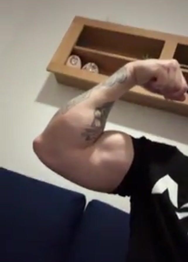 person flexing their arm to display their bicep muscle. The person is wearing a black shirt and has a tattoo on their forearm. The background includes a blue couch and a wooden shelf with items on it. The arm is flexed several times, showing the muscle definition. The camera angle is from below, looking up at the arm.