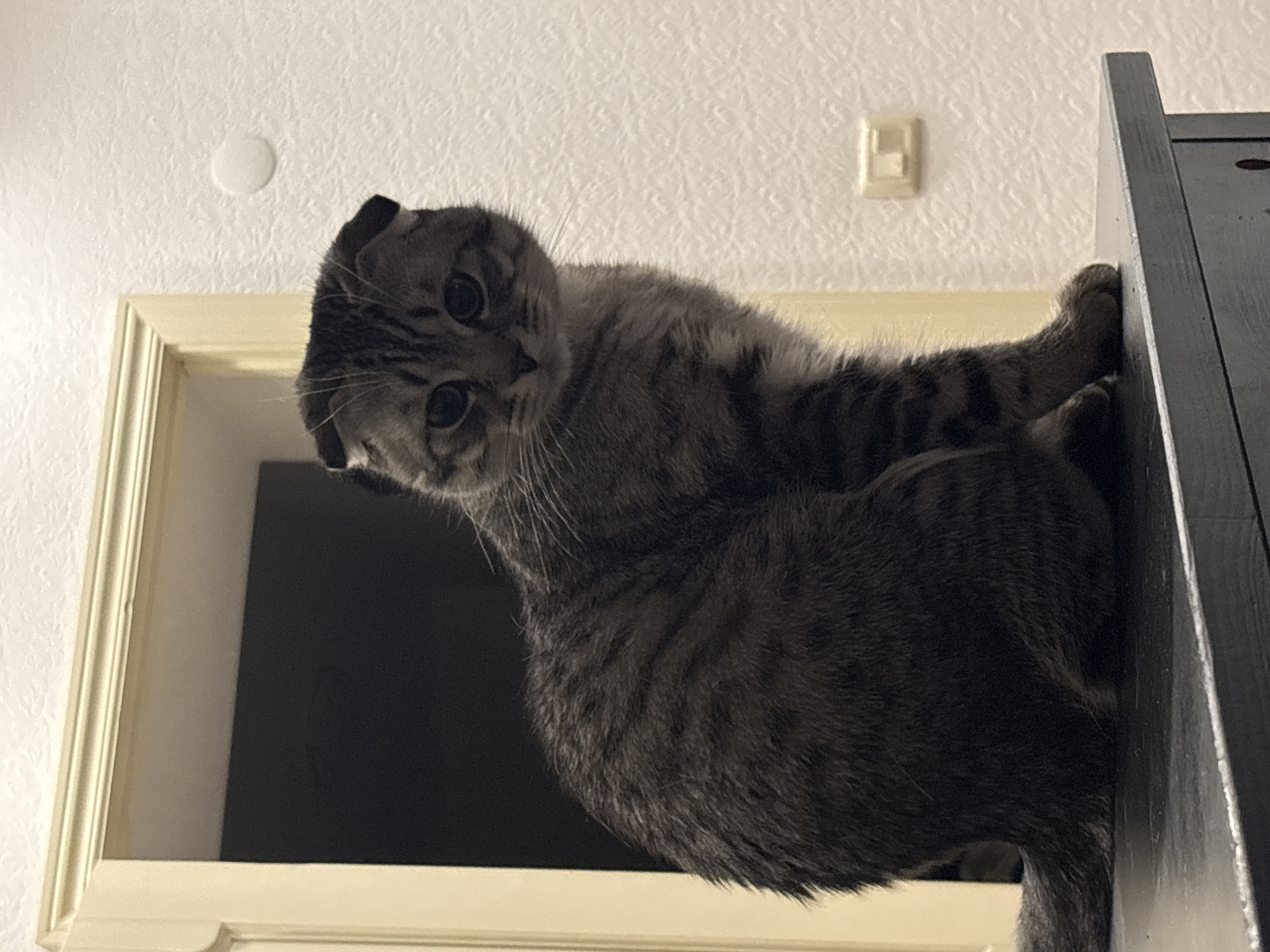 A gray tabby cat with folded ears is perched on the edge of a dark gray cabinet or bookcase in front of a window
