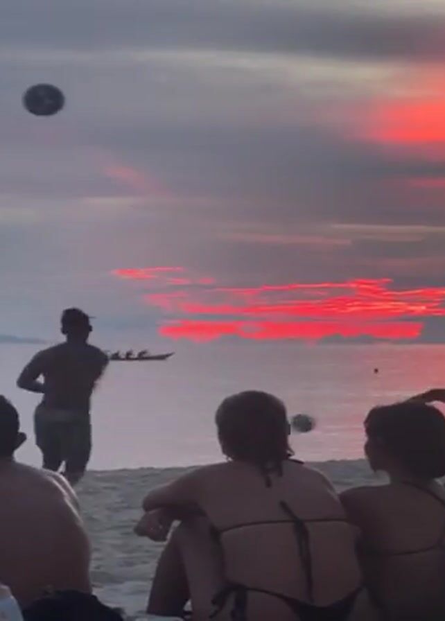 Several people are relaxing on a beach, silhouetted against a red and grey sunset sky. Two young women are sitting with their backs to the camera, wearing bikini tops. A bare-chested man with dreadlocks is playing with a ball on the sand. Another bare-chested man runs in the background. In the distance, a boat with several people in it can be seen on the water, silhouetted against the bright sky.