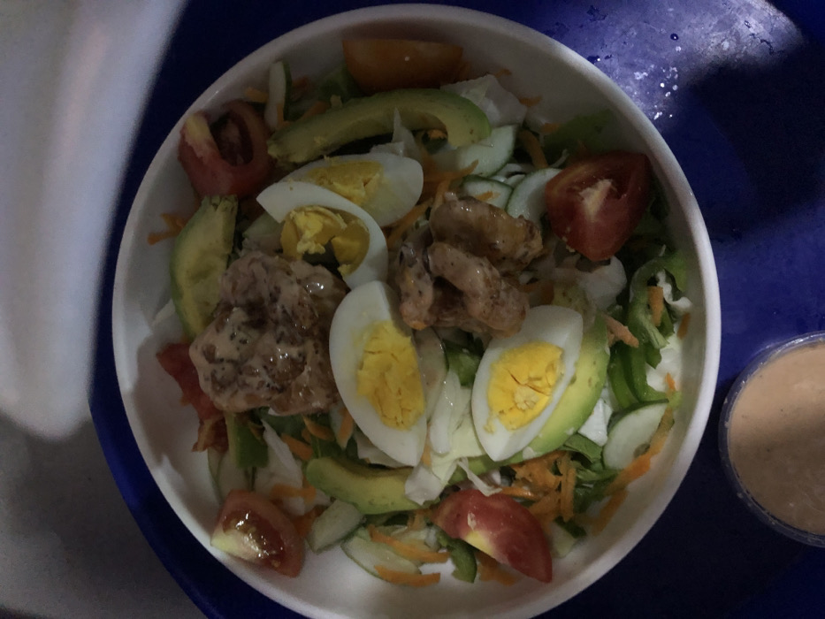 A white bowl containing a prepared salad rests on a matte blue surface. The salad consists of a base of shredded green lettuce, interspersed with visible pieces of sliced red tomatoes, green avocado, thin cucumber slices, and shredded orange carrots. Multiple halves of hard-boiled eggs, exhibiting yellow yolks and white albumen, are arranged throughout the salad. Several irregular pieces of cooked, seasoned chicken, coated in a light-colored dressing, are also present. A small, clear plastic container holding a light brown, creamy sauce is positioned on the blue surface to the lower left of the salad bowl. The image does not contain visual information to identify its location as Ilado, Nigeria. No individuals are present, and no actions or interactions are depicted.