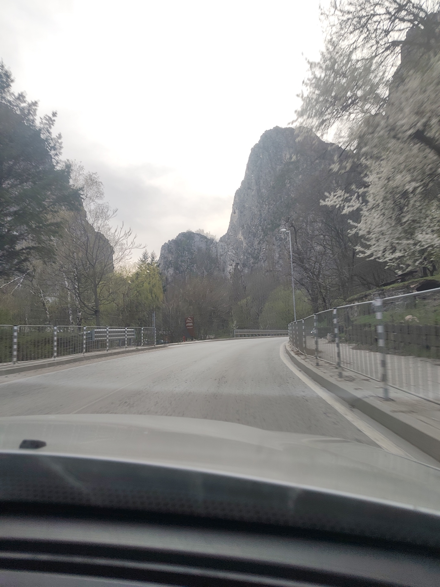 view from inside a vehicle moving on a road. The road curves slightly to the right, flanked by metal railings on both sides. Beyond the railings, there are trees and shrubbery. In the background, there are large rocky mountains under a partly cloudy sky. The location appears to be in the Vratsa region of Bulgaria, based on the landscape. There is a sign on the left side of the road.