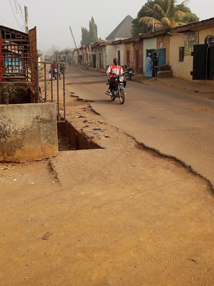 This image depicts a street scene in the city of Television, Nigeria, under hazy daylight conditions. The foreground features an unpaved reddish-brown dirt area on the left, leading to a concrete barrier approximately 0.7 meters high, marked with faded black numerals. Adjacent to this barrier is an open concrete culvert, partially filled with dirt and debris, with a metal gate structure directly behind it. The paved asphalt road begins slightly right of the frame's center, exhibiting significant erosion and broken edges, revealing underlying dirt. A male individual is positioned on the asphalt road, operating a dark-colored motorcycle with chrome components, including handlebars, headlight rim, and exhaust. He wears a red and white patterned long-sleeved shirt over dark trousers and black shoes. His posture suggests forward movement down the street, away from the viewer. To the immediate right of the road, a continuous line of single-story buildings extends into the distance. These structures vary in facade, with some appearing to be plastered and painted in muted tones like beige and light yellow, while others show exposed construction materials. One building on the right features a blue-painted entrance where two figures are standing; one individual is clad in a light blue traditional garment. Another dark motorcycle is parked in front of one of these buildings. The midground and background continue with similar architectural patterns of low-rise buildings. Sparse vegetation, including a palm tree and several tall, slender trees, is visible between and behind the structures. A distinct dark pyramidal roof structure rises above the distant buildings against a hazy, light gray sky. The road surface remains inconsistent, transitioning between worn asphalt and dirt, with scattered litter present along the shoulders. Further down the street, additional motorcycles and individuals are discernible.
