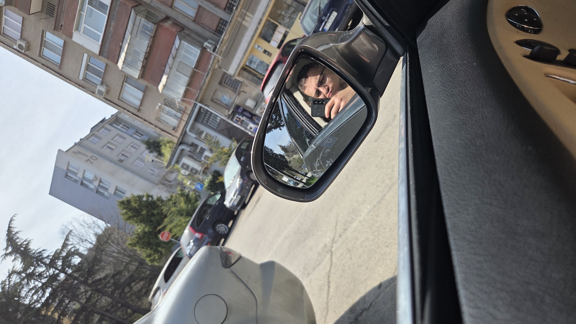A photograph taken from inside a vehicle's passenger compartment captures a street scene in Stara Zagora, Bulgaria. The immediate foreground features a black and tan textured door panel with circular control buttons. The passenger-side mirror, positioned centrally, reflects a male individual with short hair and eyeglasses, holding a black smartphone with the screen facing away, and making a "duck face" expression. Beyond the vehicle, the exterior environment shows a paved urban street with multiple parked cars. A silver-grey vehicle's rear bumper is partially visible on the left. Further down the street, a dark blue Volvo XC90 SUV is parked, followed by other sedans and hatchbacks, one of which displays a Bulgarian license plate "CB 7533 AT" in the mirror reflection. A red octagonal STOP sign and a blue "P" parking sign are discernible on the street. The background features several multi-story buildings under a clear blue sky. A prominent light grey/blue building with numerous windows bears the number "70" on its facade. Adjacent to it is a tan/brown building equipped with multiple external air conditioning units and balconies. Interspersed between the buildings and along the street are various trees, some with bare branches indicative of early spring or late autumn, and some evergreen shrubs.