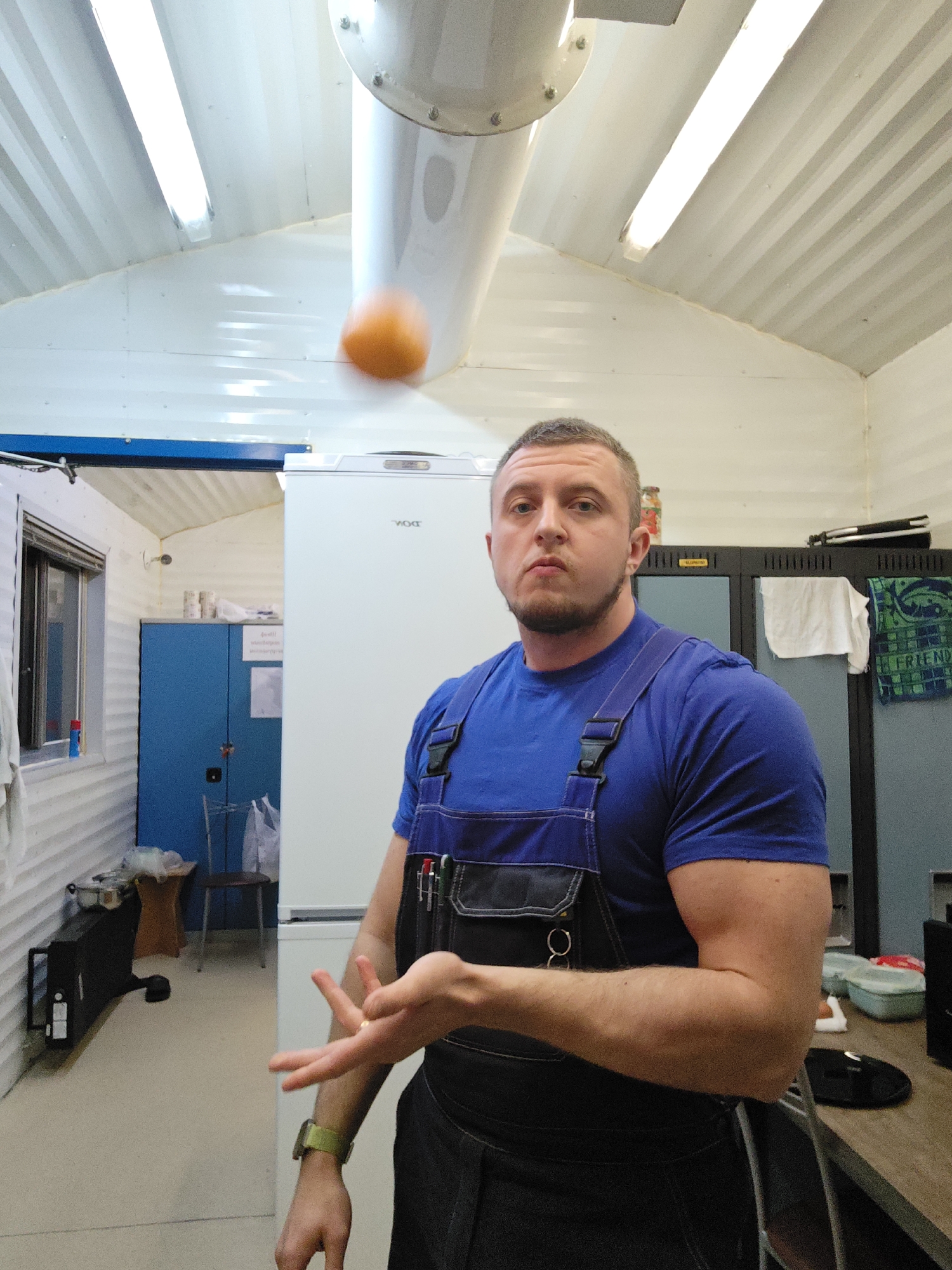A man in blue overalls and a blue t-shirt is tossing an orange in the air in a room with white walls and ceiling. The room contains a white refrigerator, a blue cabinet, a black cabinet, a window, a chair, and various other objects. The exact location in the city of Unknown, Russia is not discernible from the image.