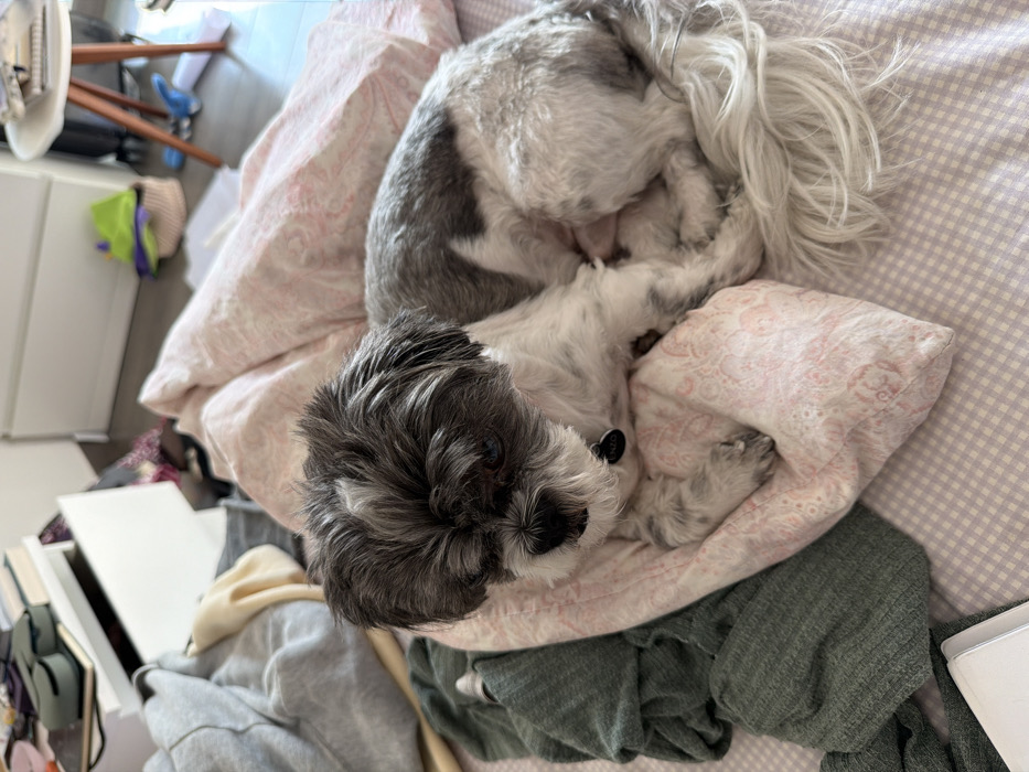 A gray and white Shih Tzu dog rests comfortably on a bed