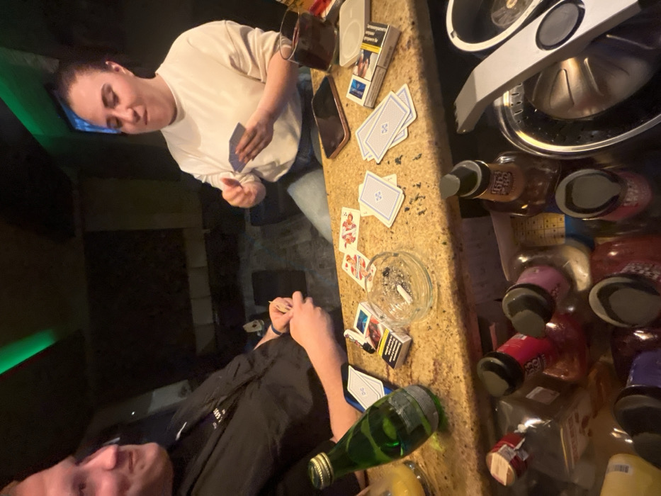 The scene, located in Svishtov, Bulgaria, shows two individuals seated at a light-colored, speckled counter in a dimly lit indoor environment with green accent lighting overhead. On the left, a male with fair skin, wearing a dark shirt, is visible from the chest up, looking towards the right with a slight smile. His hands rest near the counter. On the right, a female with fair skin, wearing a light-colored long-sleeved shirt and blue jeans, holds a hand of playing cards, looking down at them. On the counter between the individuals, a clear glass ashtray holds several cigarette butts and ash. To the left of the ashtray, a partially opened pack of Marlboro cigarettes, a blue card box, a green glass bottle of water, and a glass containing orange juice are present. To the right of the ashtray, several playing cards are scattered; some face up (including a Joker card), and others face down, displaying a blue back with a white geometric pattern. A dark-colored smartphone rests face down near a glass containing a dark beverage and a pack of Parliament cigarettes. Below the counter, a collection of various liquor bottles in different shapes and colors is visible.