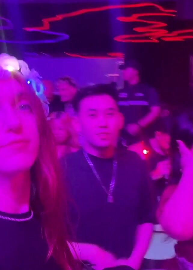 crowded nightclub with people dancing and socializing. A person wearing a glowing flower crown is filming themselves in the foreground, while others dance and move around them. The club has colorful neon lights and a sign that says "CLUB". The atmosphere is dark and energetic.