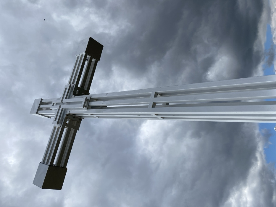A large, architecturally designed white cross stands prominently on Galata Hill in Varna, Bulgaria. The cross is constructed from multiple vertical and horizontal rectangular beams, creating a hollow, skeletal framework that gives it a modern appearance. Its stark white color contrasts against the heavily overcast sky, which is dominated by dark, tumultuous grey storm clouds. A small patch of blue sky with lighter clouds is visible at the bottom edge of the frame, beneath the base of the cross. A diminutive, dark, winged object is discernable in the upper right portion of the cloudy sky. The photograph is taken from a low angle, emphasizing the monument's height and its upward reach into the dramatic sky. No individuals or other distinct environmental features are present.