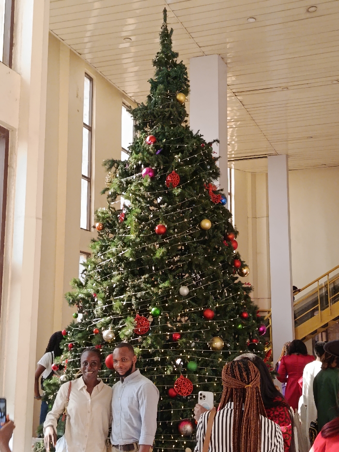 The image displays a brightly lit indoor scene, likely within the lobby of the Transcorp Hilton Abuja in Nigeria. A very tall, fully decorated Christmas tree, extending towards the high ceiling, dominates the central frame. The tree is adorned with numerous warm white string lights, various spherical ornaments in red, gold, silver, green, pink, and blue, and several red intricate patterned ornaments. In the foreground, a Black woman and a Black man stand side-by-side, smiling and directly facing the camera, evidently posing for a photograph. The woman wears a light-colored, possibly beige or cream, long-sleeved button-up shirt and carries a light-colored bag over her left shoulder. The man wears a light blue long-sleeved collared shirt, a light-colored belt, and dark pants. To the immediate right of the couple, partially obscured, an individual with light brown braided hair is seen from behind, holding up a white smartphone with multiple camera lenses to capture the scene. Another hand, holding a dark smartphone, is visible in the lower-left corner, also pointing towards the couple. The background reveals a spacious interior with tall, narrow vertical windows on the left, allowing natural light into the area. Light-colored columns and a paneled ceiling are also visible. On the right side of the image, a staircase with a yellow railing ascends, and several other individuals are present in the wider background, including one person in a red outfit and another in a green top.