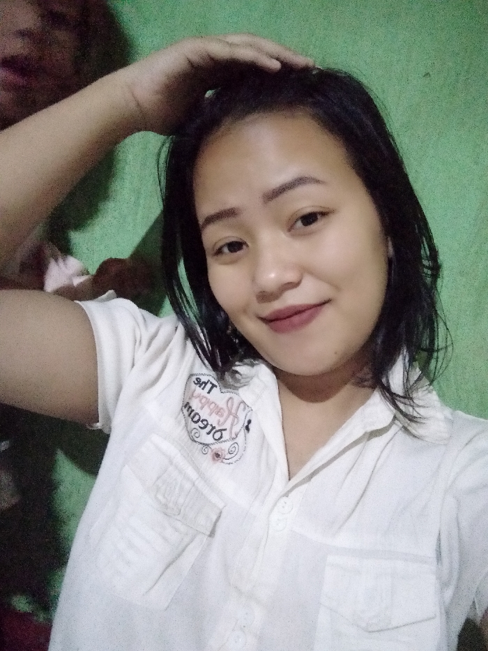 A young Asian woman poses for a selfie. Her left hand rests on her head, which is covered with dark hair. She wears a white short-sleeved shirt with a small embroidered emblem on the left side. The background consists of a blurry figure and a green wall. The woman is smiling, and her lips are colored with dark lipstick. The overall lighting appears dim.