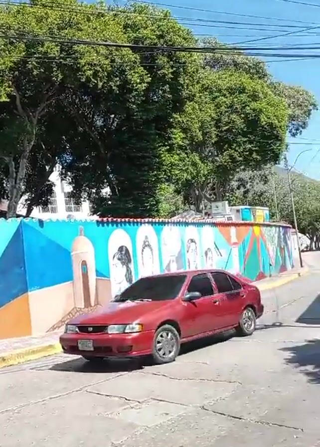 street view of a town on a sunny day. The camera pans across a colorful mural on a wall, featuring portraits, geometric shapes, and a depiction of a building with a bell tower. A red car is parked near the mural. As the camera pans to the right, a street stretches into the distance, flanked by buildings. A utility pole with wires is visible. A person walks in the distance. Then, a man in an orange safety vest walks across the street in front of the camera.