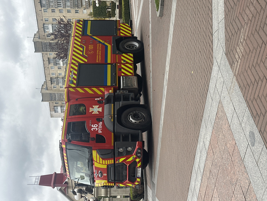 - "A red and yellow Ukrainian fire truck (Ford chassis, 4x2 configuration) is parked on a patterned paved surface under an overcast sky in Irpin, Ukraine" by FM-vN6QQ2, licensed under CC BY 4.0