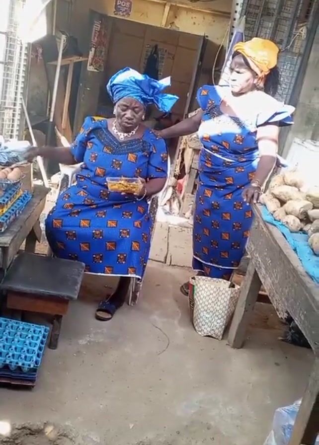 Two women in matching blue dresses are in a market setting. One woman is sitting and eating from a plastic container with a spoon. The other woman is standing beside her, resting her hand on the seated woman's shoulder. In the background, there are eggs, yams, and various market supplies. The area is covered in dirt and concrete.