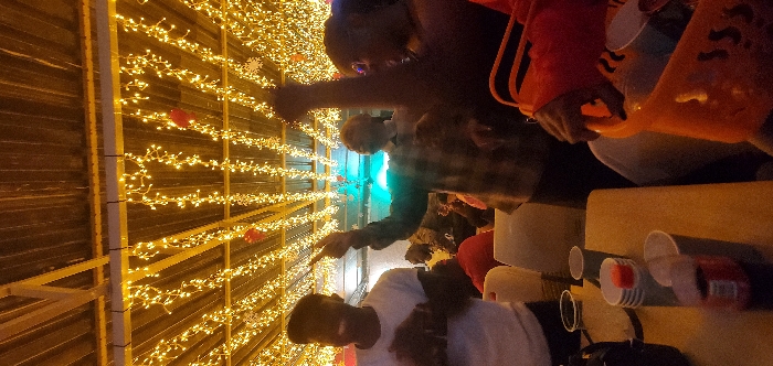A group of people gather under a canopy of warm white fairy lights, some with red accents. A person in a plaid shirt points towards the lights. A man in a white shirt is also present. An orange food container sits on a surface surrounded by cups. The scene is lit by the fairy lights and a blueish glow from further back. The image is taken at an unusual angle.