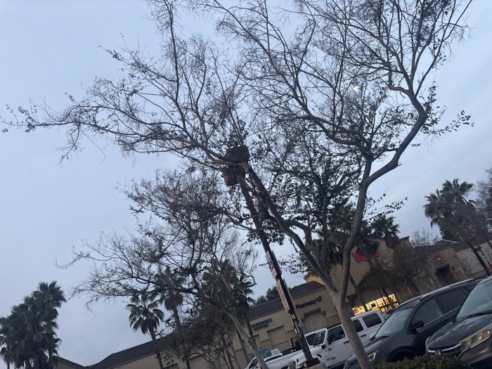 The image depicts a commercial parking lot scene under an overcast sky, likely at dusk or on a heavily clouded day, within the city of Inglewood, California. A faint, gibbous moon is visible in the upper central sky, and a fixed-wing passenger aircraft is in flight in the upper left quadrant. The foreground and midground are dominated by several deciduous trees with bare branches, indicating a cooler season, interspersed with multiple palm trees. In the background, low-rise commercial buildings line the far side of the parking lot. Identifiable businesses include a "VONS" supermarket (indicated by a large red sign), a "PHARMACY" storefront, and a "STARBUCKS COFFEE" shop. Numerous parked vehicles, including dark-colored SUVs and a white Jeep-like vehicle, occupy the asphalt parking area. No individuals are visible. This scene is consistent with a commercial shopping center, such as the one located near 11200 Crenshaw Blvd, Inglewood, CA.