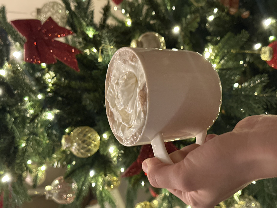 - "A close-up shot features a white mug overflowing with whipped cream, positioned against a blurred Christmas tree backdrop adorned with twinkling lights and festive ornaments like red bows and golden baubles" by FM-9wAJk1, licensed under CC BY 4.0