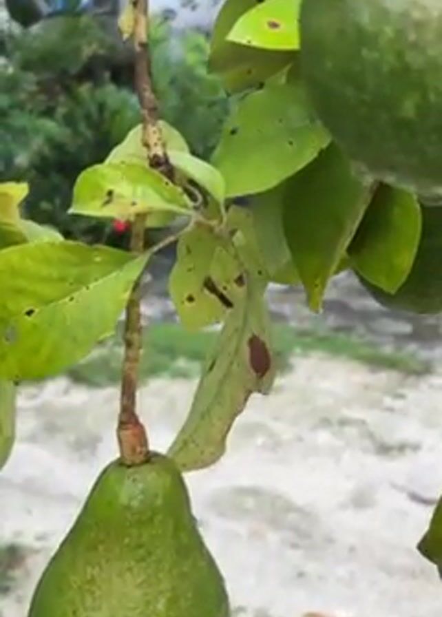 The camera focuses on avocados growing on a tree branch. The avocados are green, with water droplets on the skin. The leaves on the tree are a mix of green and yellow, some with brown spots. A hand reaches into the frame, appearing to touch the avocados. The background is a blurry mix of green grass and a light-colored, possibly paved surface.