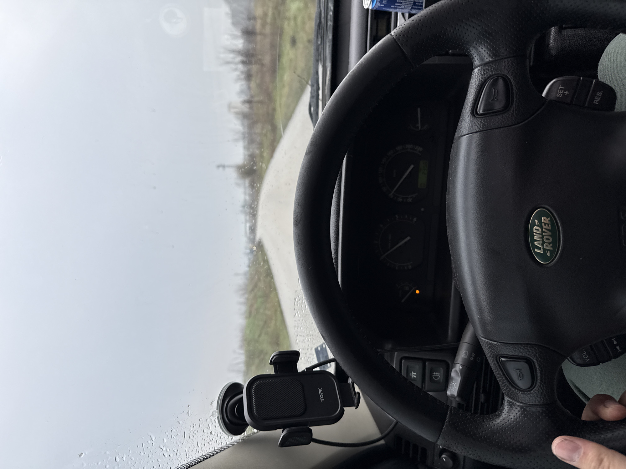 The image displays a first-person view from the driver's seat of a Land Rover vehicle, located in or near Lom, Bulgaria. The driver's left hand grips a black, multi-function steering wheel featuring the "LAND -ROVER" emblem, horn button, and cruise control controls. Behind the steering wheel, the instrument cluster is visible with two gauges, a digital display showing '239.5', and an illuminated amber warning light. A black TOPK brand phone mount, secured by a suction cup, is attached to the windshield on the left. The windshield is covered in numerous water droplets, indicating rain or damp conditions. Beyond the windshield, a wet road stretches forward and curves slightly to the right in the distance, bordered by sparse, dormant vegetation and fields. A tall pole structure stands in the mid-ground on the left, while a large, distant tower-like structure is faintly visible on the right horizon. A blue and silver beverage can is partially visible on the passenger side of the dashboard.