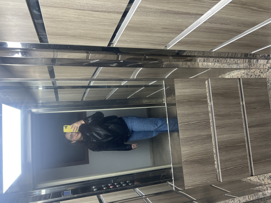 A person in a black jacket and blue jeans takes a selfie in a mirrored elevator. The phone, held in the left hand, is yellow. The elevator has a mirrored wall and a control panel visible. Above, the ceiling panels feature a light wood grain pattern with thin silver stripes. The elevator's side walls are covered in matching wooden panels with silver edges.