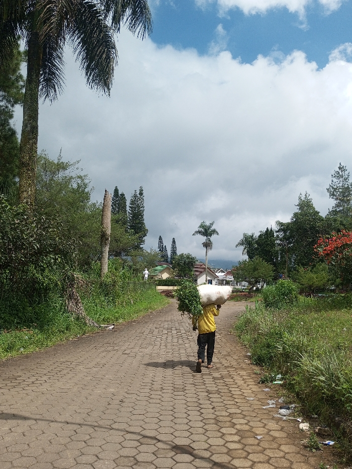 The image captures an outdoor scene on a partly cloudy day in Nuwara Eliya, Sri Lanka. A single individual, viewed from behind, walks away from the camera along a paved road made of grey hexagonal interlocking pavers. The person is wearing a yellow long-sleeved shirt and dark trousers, with sandals. They are carrying two distinct loads balanced on their head and shoulders: a bulky white sack-like object on their right side and a large bundle of green leafy vegetation on their left side. To the left of the road, dense green vegetation, including a prominent palm tree trunk in the foreground and a bare tree stump, lines the path. Overgrown bushes and grass cover the ground. To the right of the road, the shoulder is covered with grass, weeds, and some scattered litter. In the background, a cluster of houses with light-colored walls and dark roofs is visible amidst various trees, including tall conifers and smaller palm trees. A second, distant figure, clad in white, is partially visible near a building on the left side of the background. Distant hills are faintly discernible beneath a sky that displays both significant white cloud cover and patches of blue. Shadows from overhead trees fall upon the paved road.