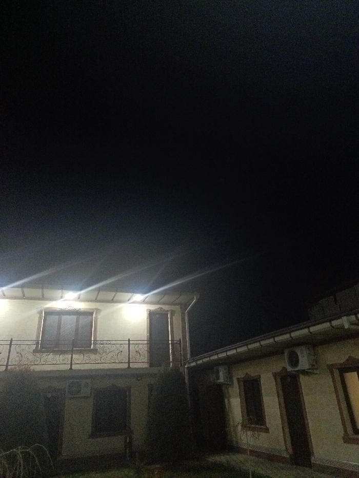 Two adjacent buildings stand beneath a dark sky. The left structure has two stories, featuring dark-framed windows, a balcony with decorative railings, and an air conditioning unit. The right building appears as a single-story extension with matching window frames and another air conditioner. Minimal vegetation is visible at the base. A bright light source above the buildings illuminates the scene.