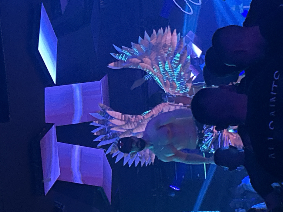 The image depicts a male performer on a stage within a nightclub environment, specifically THE TERMINAL (TT) club in Sofia, Bulgaria, identifiable by the distinctive large 'TT' shaped light structures overhead. The central figure is a muscular, shirtless male, wearing a dark baseball cap and metallic silver shorts. He is equipped with large, elaborate wings composed of numerous layered, pointed segments, illuminated with a blend of pink, purple, and cyan light. He stands facing forward, with his arms at his sides. In the foreground, the silhouetted heads and shoulders of several individuals indicate an audience observing the performer. One person in the immediate foreground wears a dark t-shirt with "ALLSAINTS" printed in white on the back. The scene is predominantly lit with blue and purple ambient and stage lighting.