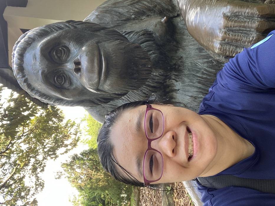 A woman in a blue shirt and purple glasses smiles, positioned beside a bronze ape statue
