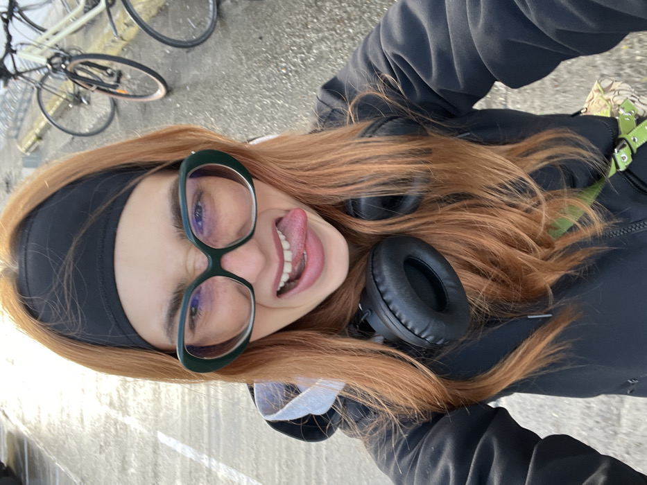 An individual is depicted in a close-up selfie taken outdoors in Pantin, France. The subject, possessing long, light reddish-brown hair, wears a black headband, large green-framed glasses, and a black hooded jacket with black over-ear headphones resting around the neck. The individual's expression is playful, characterized by a crinkled nose, open mouth, and extended tongue, directed towards the camera. A bright green strap with a silver buckle, belonging to a bag, is partially visible on the lower right. The background consists of a wet, paved surface exhibiting faint white markings. A metal bicycle rack is partially visible, supporting two bicycles – one with a dark frame and one with a light frame. The scene is illuminated by bright, direct sunlight.