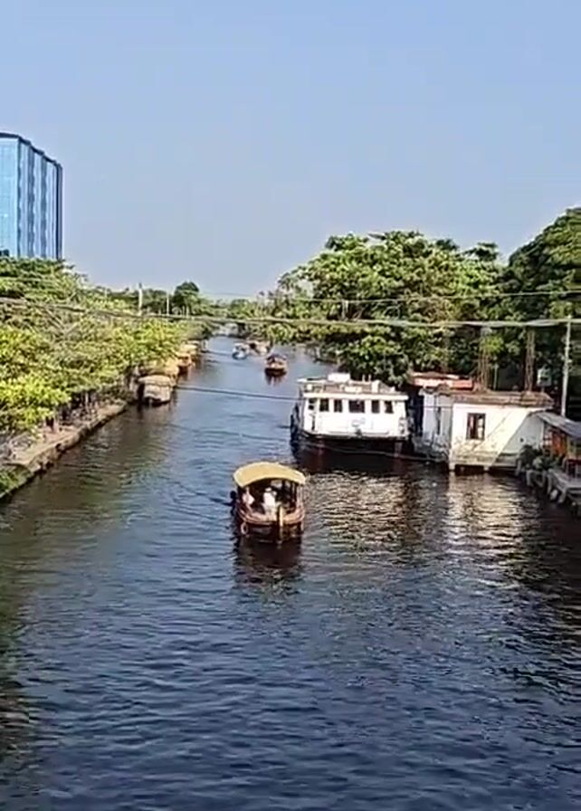 The video presents a waterway scene with several boats traversing the water, appearing to be in a canal or river with well-defined banks. The water has a dark, rippled surface, and the sky above is clear and light blue. On the left bank, there is a row of neatly arranged trees, alongside a modern building with a blue exterior. On the right bank, there are denser trees, creating a green backdrop. A small white building with a red roof sits adjacent to the water, and a narrow walkway runs alongside the canal on this side. The boats vary in size and type. One smaller, covered boat is moving in the foreground. A larger, two-story boat is docked alongside one of the buildings. Other boats can be seen further down the waterway. The overall impression is that the area is a transportation waterway, possibly also used for tourism or recreation. The scene is taken on a sunny day, and the video is shot from an elevated position, possibly a bridge.