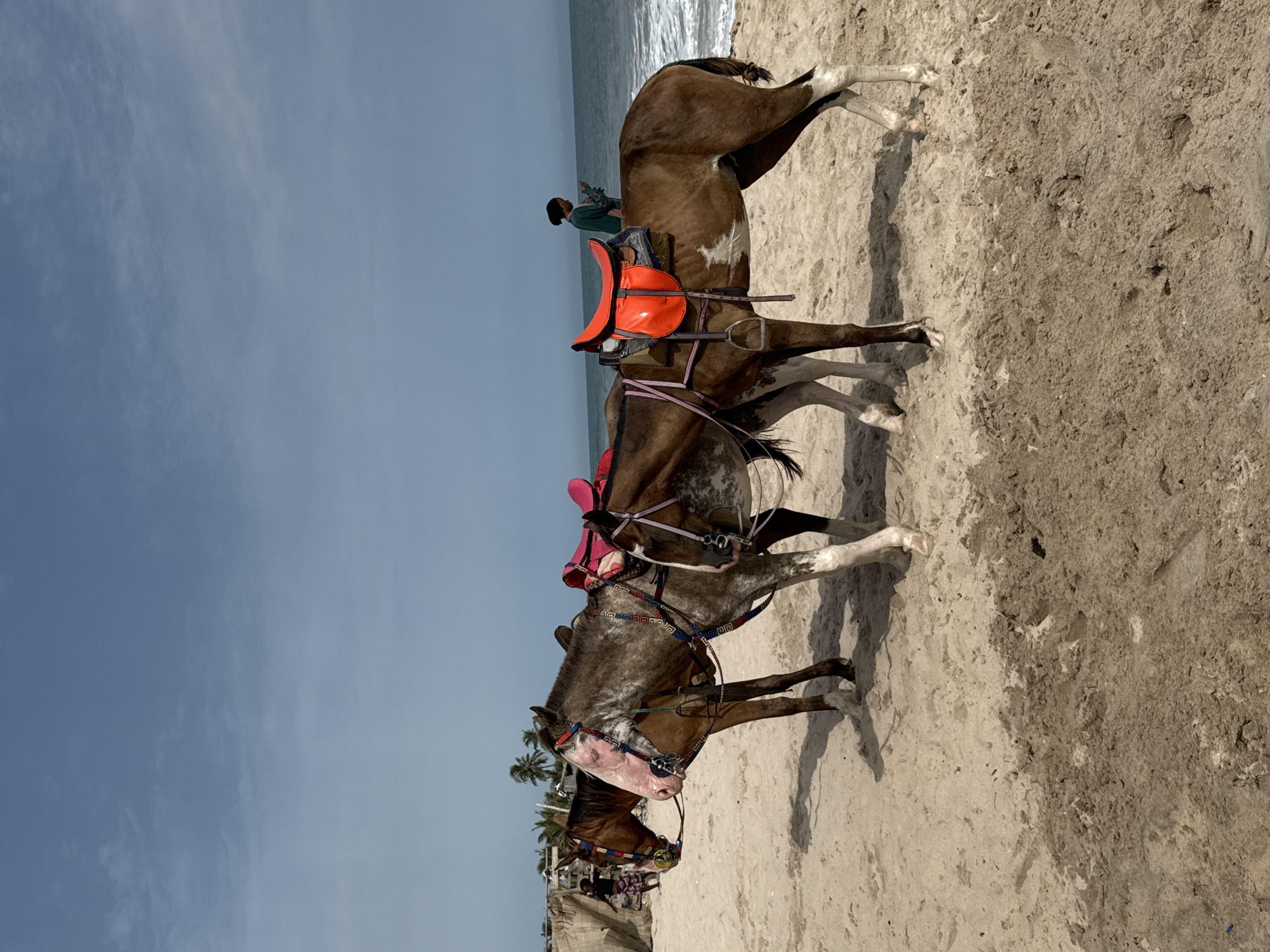 three horses on a sandy beach near the city of Mopo-Akinlade, Nigeria. One horse is being ridden by a person, while the other two stand beside it. The horses have brightly colored saddles and headgear. The background shows the ocean and a blue sky with light clouds. Palm trees and possibly buildings are visible to the left of the frame. The overall setting is a sunny day at the beach.