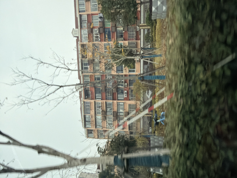 A tall, weathered building dominates the scene, its facade adorned with numerous windows and air conditioning units. A bare tree stands in the foreground, its branches stark against the overcast sky. The lower portion of the frame is obscured by dense greenery and some man-made structure. The perspective is slightly off, suggesting a somewhat skewed viewpoint.
