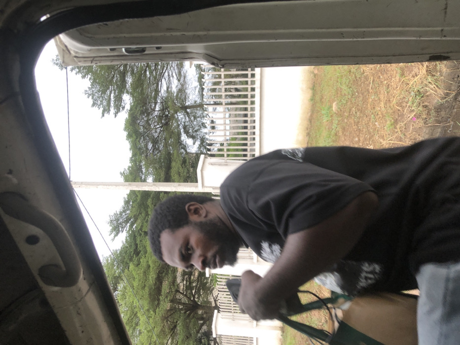An adult with dark hair and a beard peers into the interior of a light-colored van. Wearing a black t-shirt, the individual appears to be working or inspecting something inside the vehicle. The outside scene, visible through the van's open door, includes trees, a white fence, and a grassy area, suggesting a residential or suburban setting.