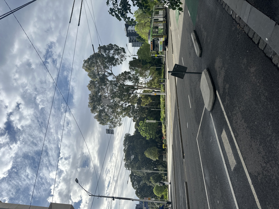 This image depicts an urban street scene in Carlton, Australia, under a partly cloudy sky with patches of blue
