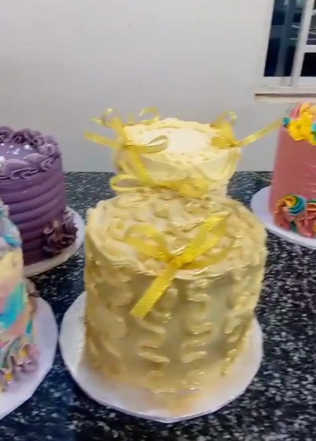 n array of cakes displayed on a countertop, likely in a bakery or kitchen setting. The cakes are decorated with various colors and textures of icing. A few of the cakes are tied with yellow ribbons. The camera slowly pans across the display, showcasing each cake’s unique design. The background includes a window with a view to the outside. There is a faint sound of music in the background.