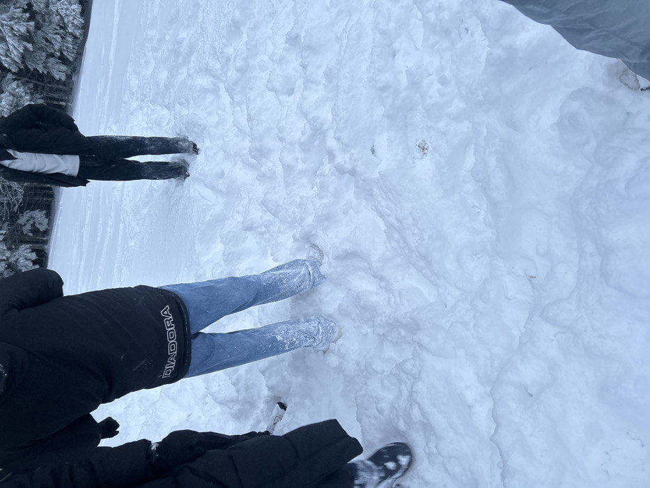 The scene depicts an outdoor, snow-covered environment in Le Hohwald, France. Deep, irregular snow covers the ground, marked by footprints and disturbed areas. Four individuals are present, primarily viewed from behind or partially. A person in the center-left wears a black puffer jacket with "DIADORA" visible in white text on the lower back, and light blue jeans heavily encrusted with snow from the mid-calf down, indicating travel through deep snow. Their footwear is obscured by snow. To their immediate left, the lower portion of a black coat and a black winter boot with a white sole, dusted with snow, are visible. Further back and to the center-right, another individual stands, viewed from behind, wearing a black puffer jacket, a white collared garment beneath it, and dark pants with snow accumulated on the lower legs and dark footwear. In the far right foreground, only the lower legs and dark, snow-covered footwear of a fourth person are visible. The background features a dense forest of evergreen trees heavily laden with snow, suggesting a winter landscape. The lighting is diffuse, indicative of an overcast sky.