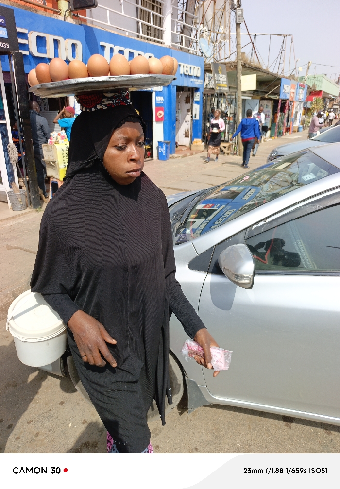The image displays an urban street scene in Jos, Nigeria, under bright daylight. A woman in the immediate foreground, facing slightly right, serves as the primary subject. She is a dark-skinned individual wearing a black hijab and a loose-fitting black abaya-style garment, with patterned leggings visible beneath. On her head, she expertly balances a flat, circular silver-colored metal tray holding approximately 12-14 brown eggs. Her left hand is positioned near a white plastic bucket with a lid, which hangs by a strap, and her right hand holds a small, clear plastic bag containing several pink-wrapped items. A ring is visible on her left ring finger. To the woman's right, a silver sedan is parked, reflecting portions of the street and buildings on its windshield and side mirror. The background reveals a bustling commercial street. Directly behind the woman is a prominent blue building with large "TECNO" signage, below which smaller "Nokia" and "Glo" signs are visible, indicating a mobile phone shop. The street continues into the mid-ground, lined with various storefronts. Multiple pedestrians are visible, including one individual wearing a blue hoodie walking away from the camera. Utility poles, overhead electrical wires, and other urban structures are present against a hazy sky. The ground surface is paved asphalt.