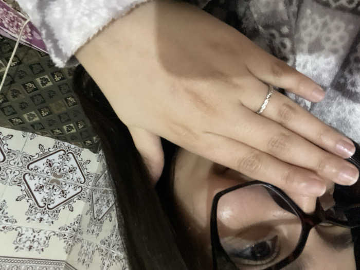 A person's face is partially visible, obscured by a hand with a silver ring