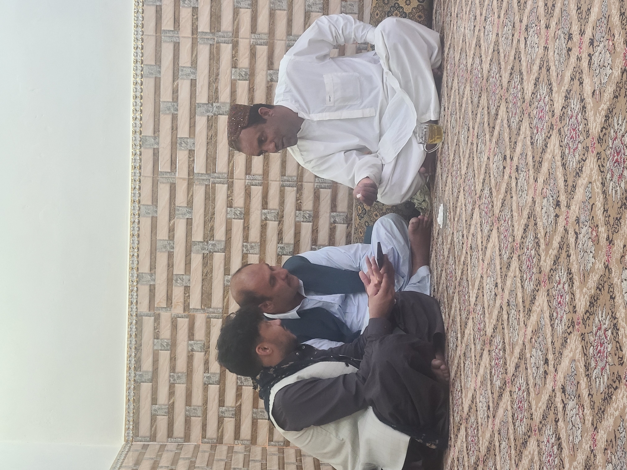 Three men are sitting on a carpet in a room in Quetta City Tehsil, Pakistan. The man on the top is wearing a white traditional outfit and a brown hat. The man in the middle is wearing a light blue shirt and a dark blue vest. The man on the bottom is wearing a white shirt and a dark grey coat. The carpet has a brown and beige pattern with floral accents. The wall is decorated with beige and brown tiles with geometric designs. There is a glass of liquid near the man wearing white. The men appear to be engaged in a conversation.