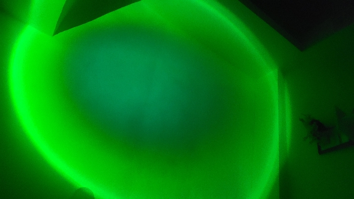 This image depicts an interior space in Nanyuki, Kenya, characterized by a dominant circular green light projection. The light, brighter at its periphery, illuminates a wall or ceiling surface, creating a gradient that darkens towards its center. Architectural features are discernible: a prominent corner where two walls meet extends diagonally downwards from the upper right, and another wall intersection is visible in the upper left. A horizontal line in the lower central area may indicate a wall-ceiling junction or a shelf. In the lower-left quadrant, a small, indistinct, dark-toned object, possibly a decorative item or plant, rests on a surface, rendered in silhouette by the green illumination. The overall scene is devoid of individuals, active subjects, or discernible interactions.