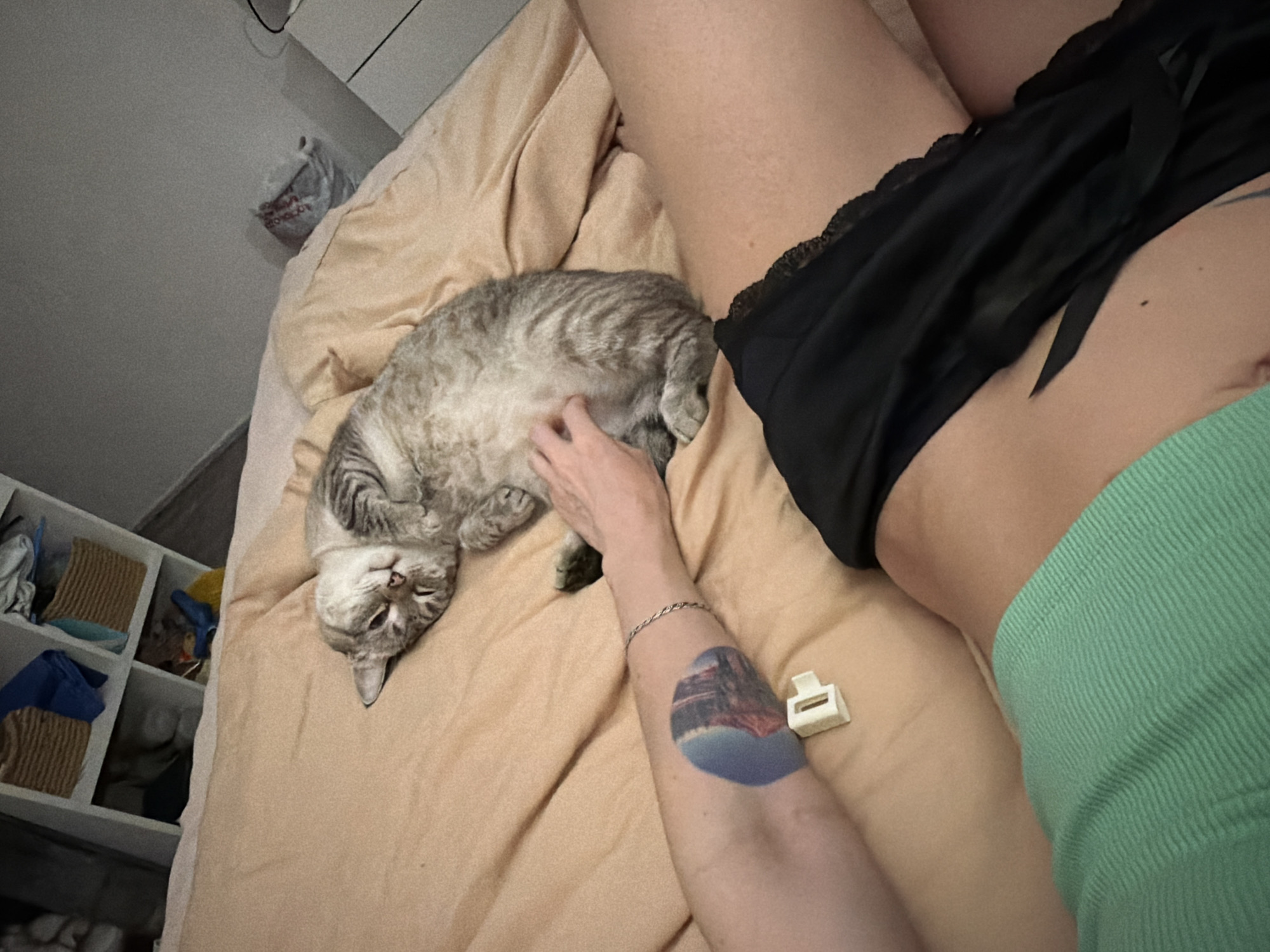 A person wearing black shorts, a green shirt, and a bracelet lies on a bed with beige sheets. The person is petting a gray tabby cat that is lying on its back. The person has a tattoo on their left forearm that shows what appears to be the Kama Bridge in Perm, Russia. A white plastic clip rests on the bed between the person's arm and the cat. A white shelving unit with miscellaneous items is visible in the lower left corner of the image. A white dresser and plastic bag are visible in the upper left corner of the image.
