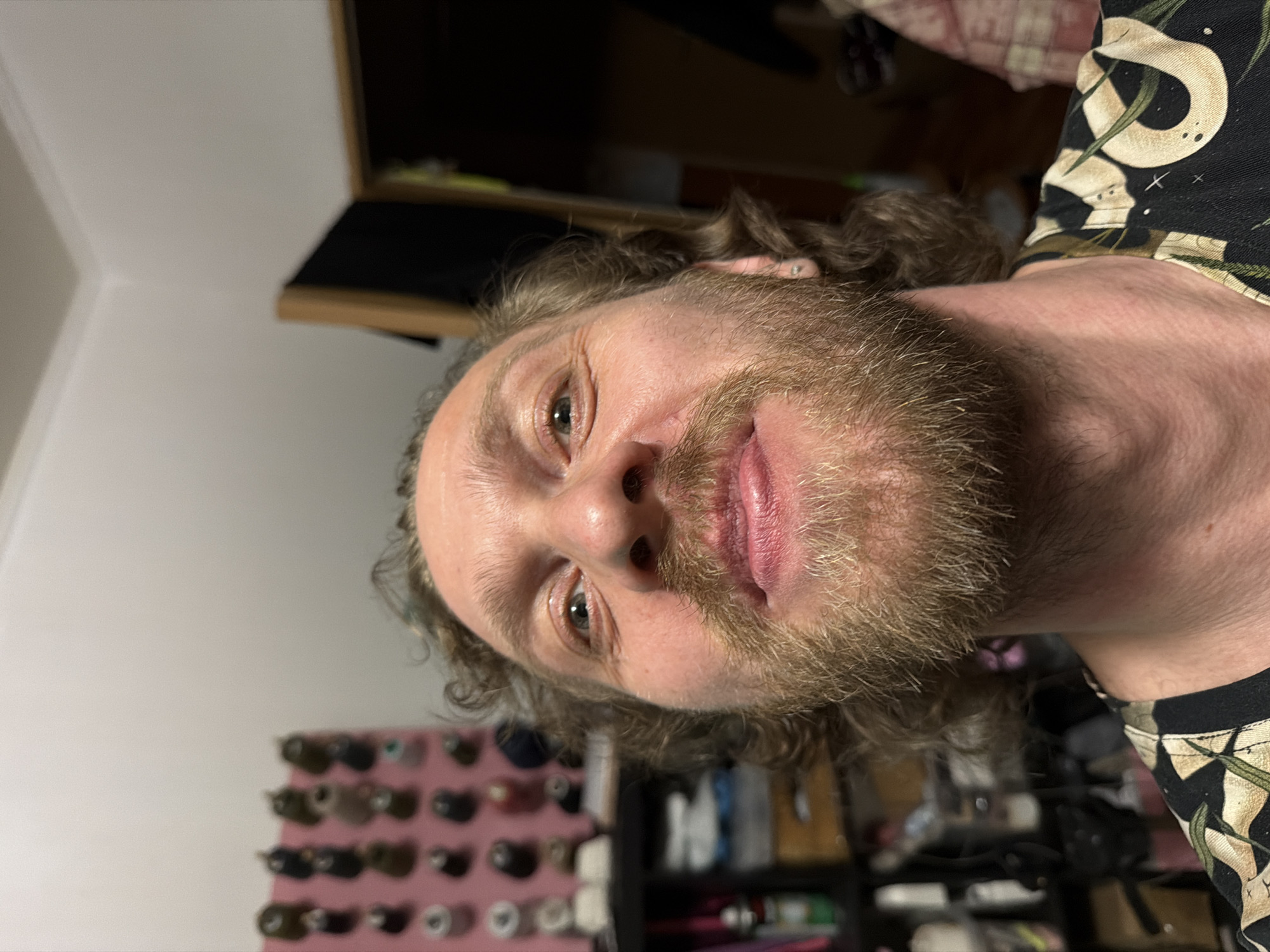 A close-up, indoor portrait of a Caucasian male with a fair complexion, light brown hair, and a full beard. He is wearing a patterned shirt with a dark background and light-colored designs. The background is cluttered with shelves containing various objects and a pink board with spools of thread. The photo appears to be taken at a tilted angle. There is no visual evidence to suggest that the photo was taken in Saint Petersburg, Russia.