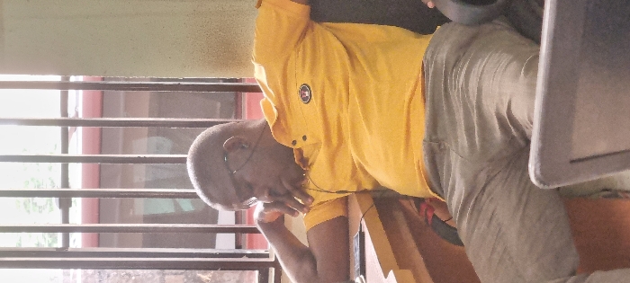An adult male, appearing to be of African descent with a closely shaved head and wearing eyeglasses, is seated indoors at a location in Ikeja, Nigeria